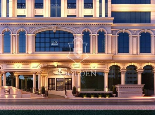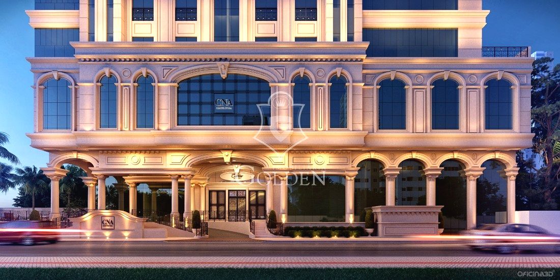 Portais dos elevadores de passageiros com acabamento em mármores importados da Espanha, Itália e Grécia