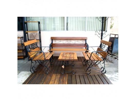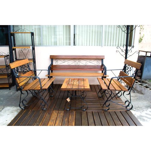 Conjunto com 1 Banco de 3 Lugares, 2 Poltronas e Mesa de centro em Madeira e Ferro