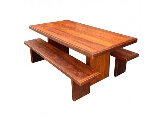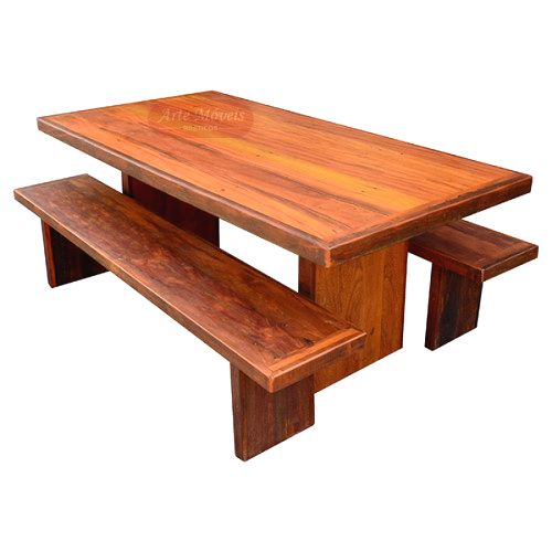 Conjunto de mesa de madeira com bancos de madeira sem encosto ideal para sua área de lazer.