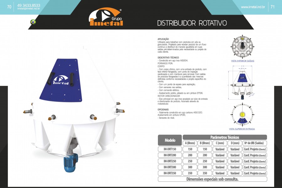 Utilizado para trabalhar com produtos em pós ou granulados. Projetado para receber produto de um fluxo contínuo e distribuir de maneira igualitária em suas saídas pré-determinados pela necessidade ou projeto de cada cliente.