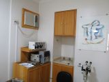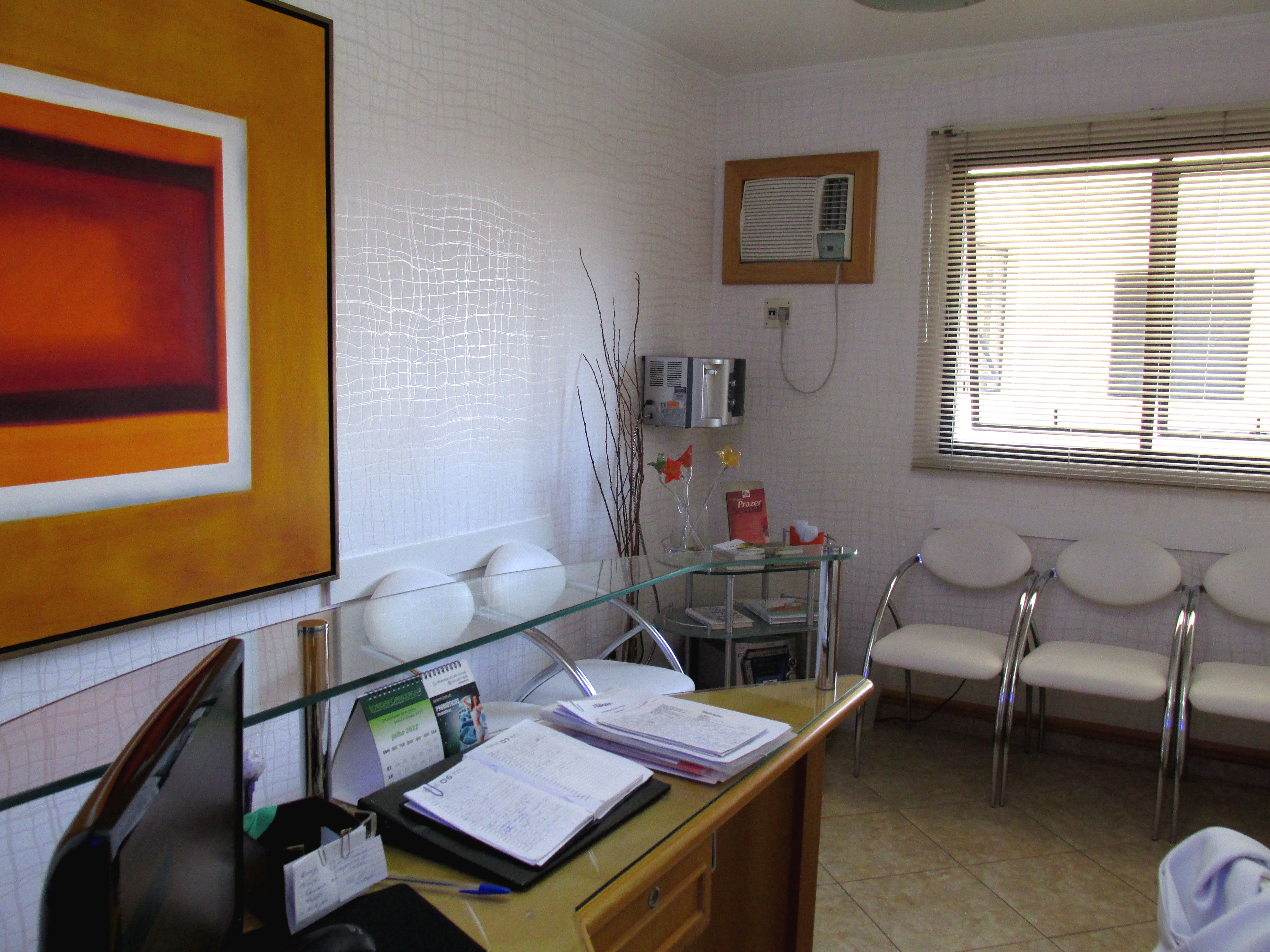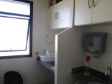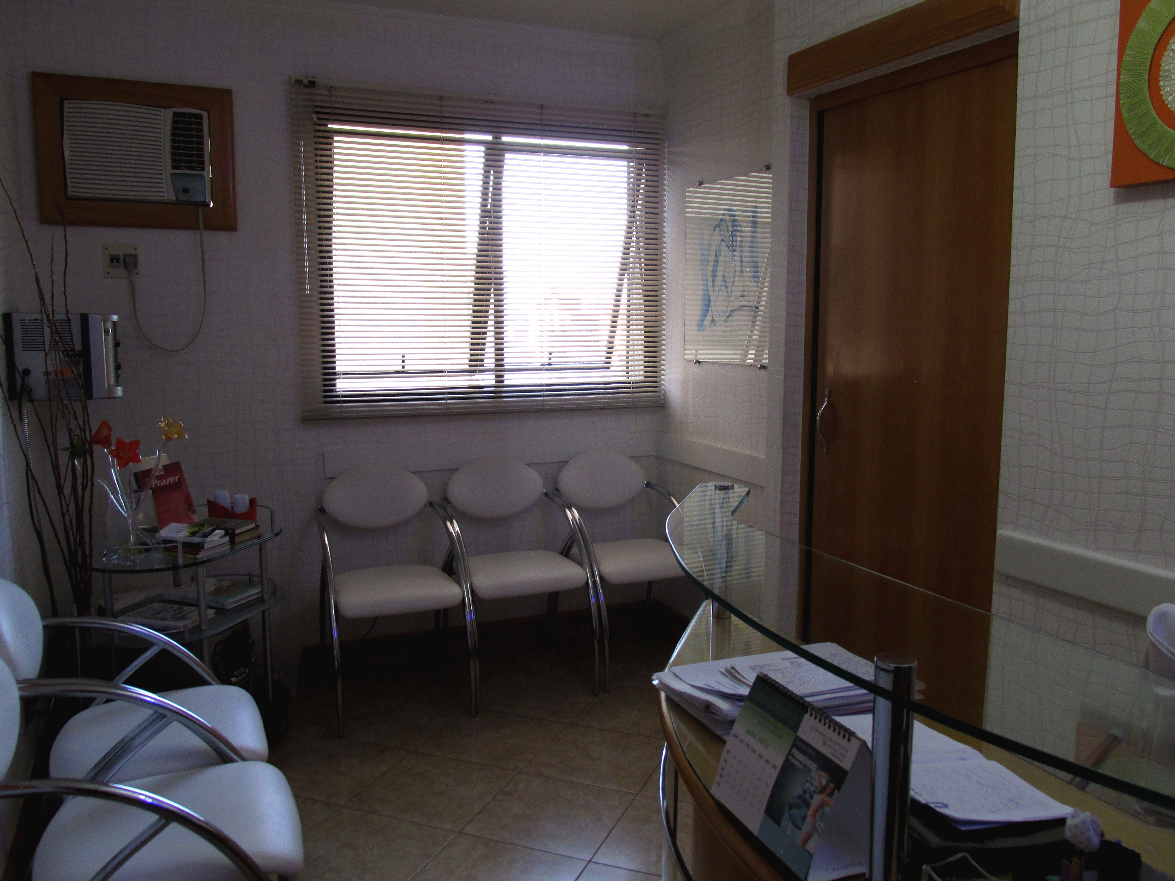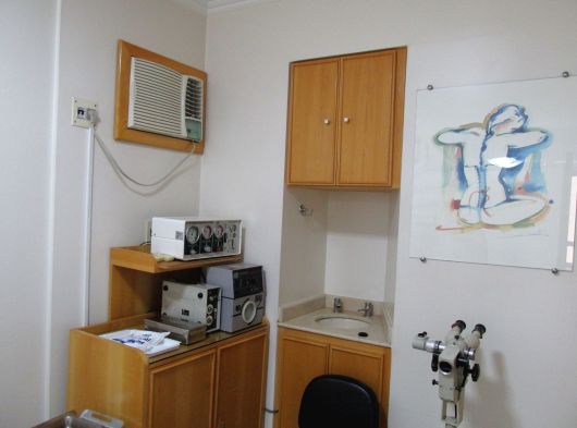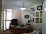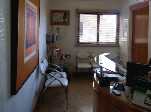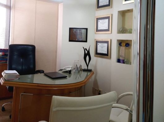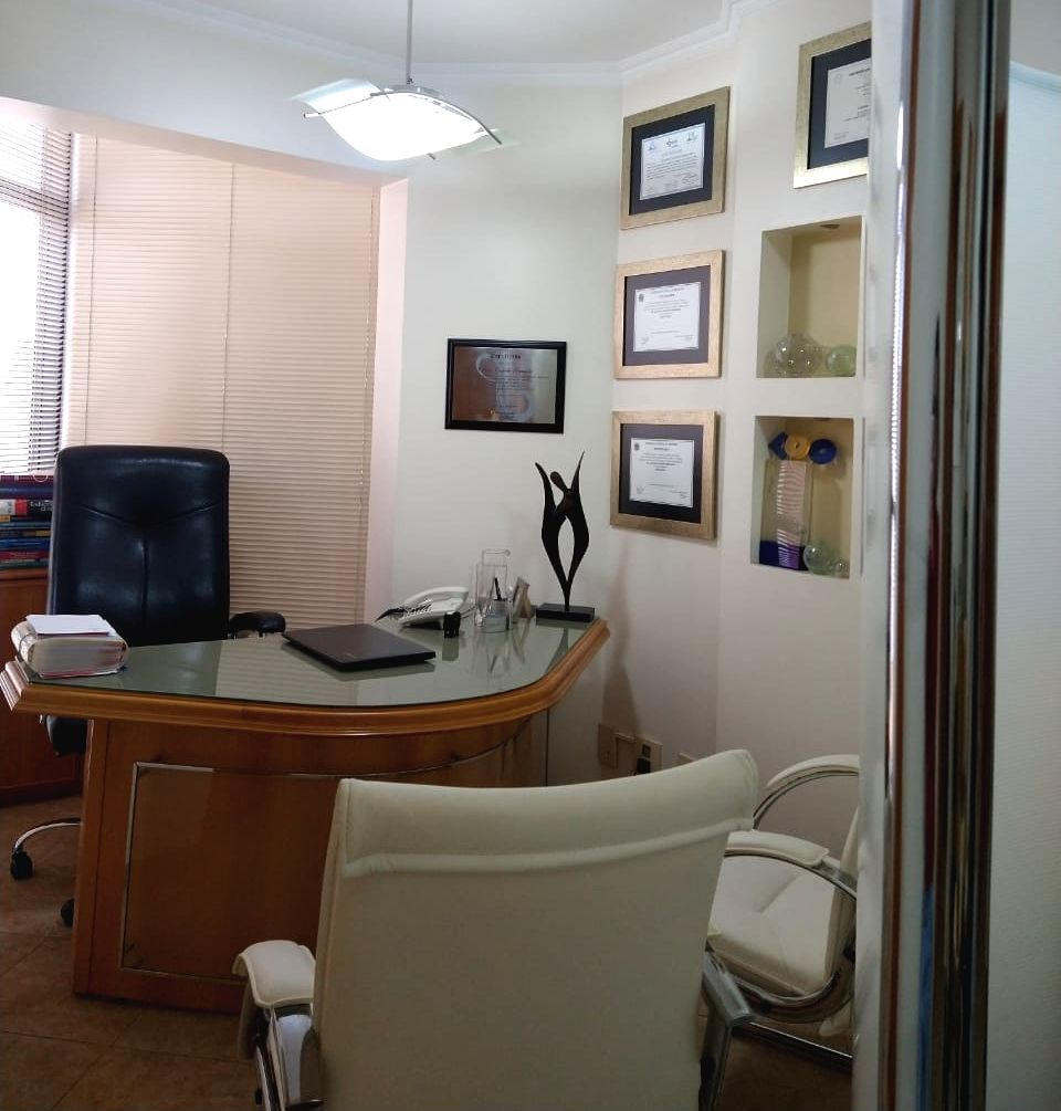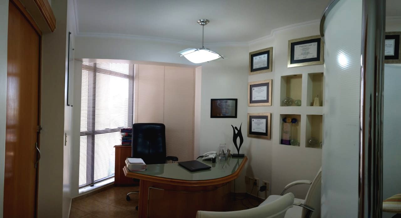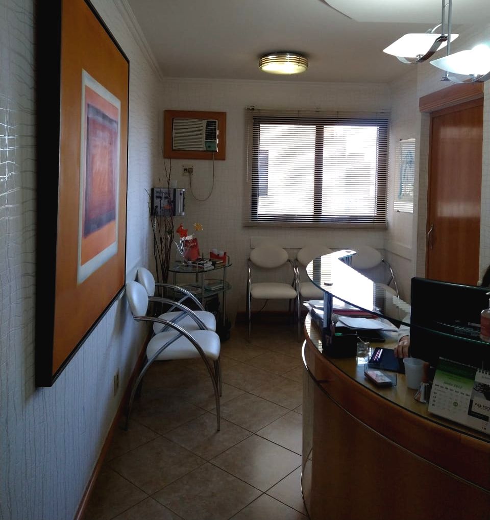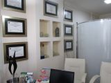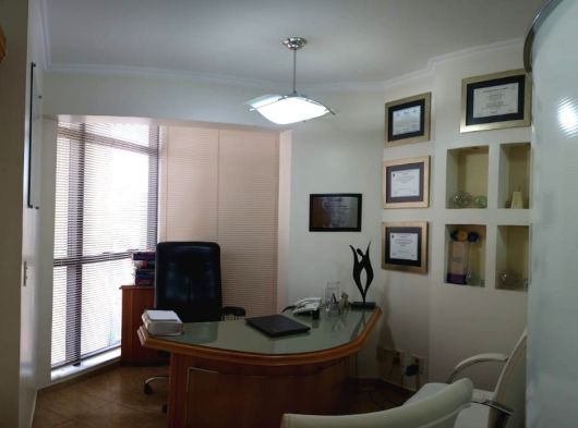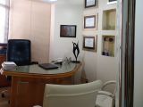 Conjunto de salas – móveis de marfim – divisórias com gesso duplo acartonado – decoração em gesso no teto e nas paredes, c/ nichos para peças decorativas – recepção c/ ar condicionado, papel de parede estofado em relevo e rodapés em porcelanato marfim – sala c/ ar condicionado, divisória semicircular criada por arquiteto, arms. embutidos e pia c/ mármore e louças de alta qualidade – WC c/ pia c/ mármore e louças de alta qualidade – piso em porcelanato – lustres estilizados selecionados por arquiteto.