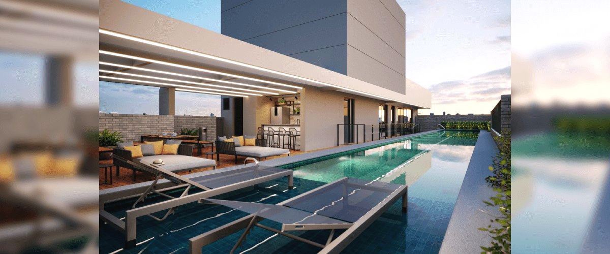 Lazer na cobertura com Academia, Espaço Gourmet com Churrasqueira e Piscina de 25m com Deck Molhado.