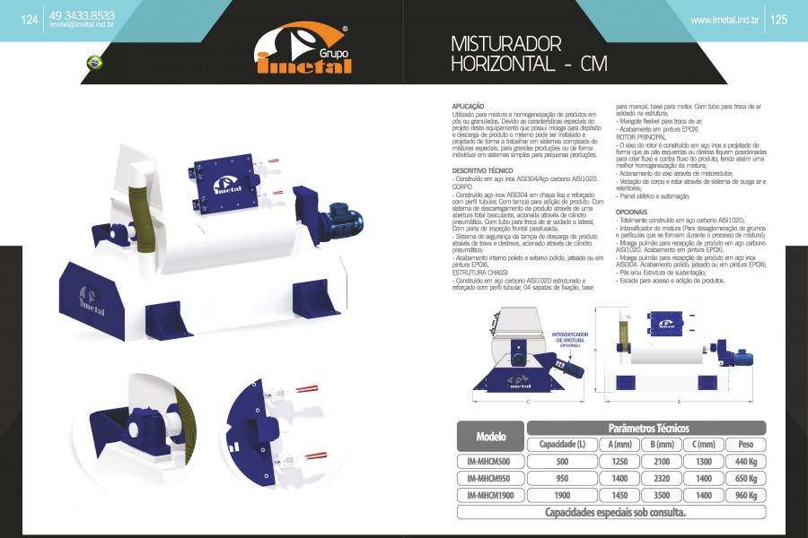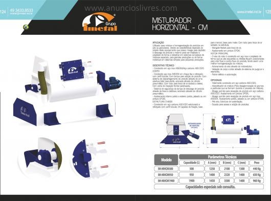 Utilizado para mistura e homogeneização de produtos em pós ou granulados. Devido as características especiais do projeto deste equipamento que possui moega para depósito e descarga de produto o mesmo pode ser instalado e projetado de forma a trabalhar em sistemas complexos de misturas especiais, para grandes produções ou de forma individual em sistemas simples para pequenas produções.