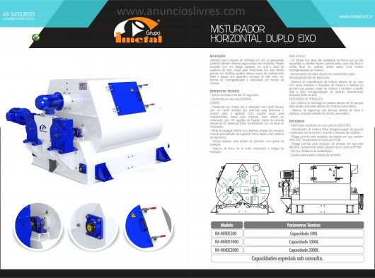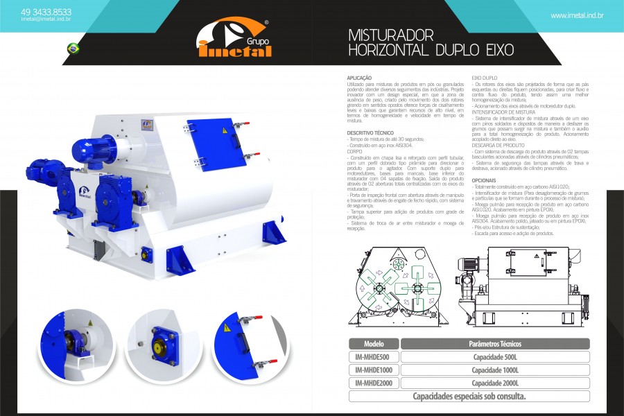 Utilizado para misturas de produtos em pós ou granulados podendo atender diversos seguimentos das indústrias. Projeto inovador com um design especial, em que a zona de ausência de peso, criado pelo movimento dos dois rotores girando em sentidos opostos oferece forças de cisalhamento leves e baixas que garantem recursos de alto nível, em termos de homogeneidade e velocidade em tempo de mistura.