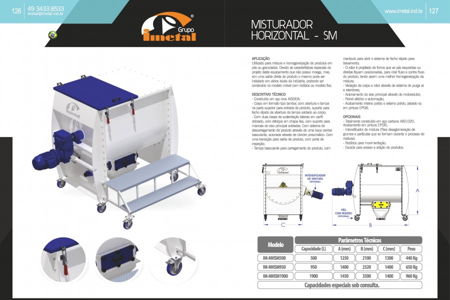 Utilizado para mistura e homogeneização de produtos em pós ou granulados. Devido as características especiais do projeto deste equipamento que não possui moega, mas, sim uma saída direta do produto o mesmo pode ser instalado em vários locais da indústria, podendo ser construído no modelo móvel com rodízios ou modelo fixo.