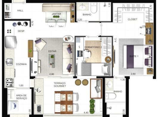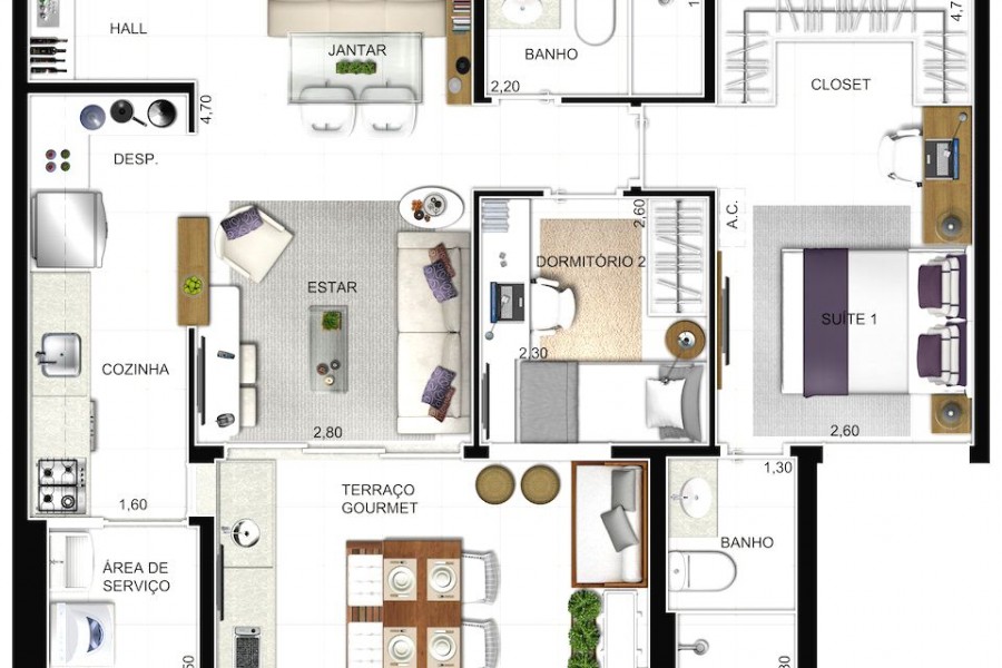 Infraestrutura de ar-condicionado na suíte principal dos apartamentos de 68m²