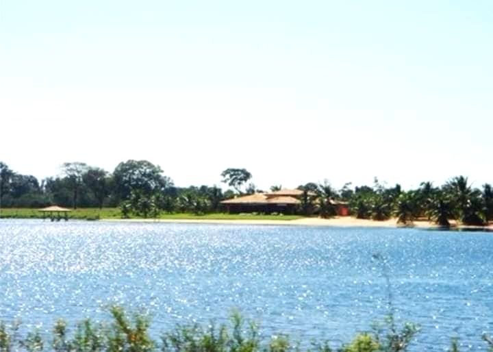 Lago com praia artificial, quiosque dentro do lago com passarela